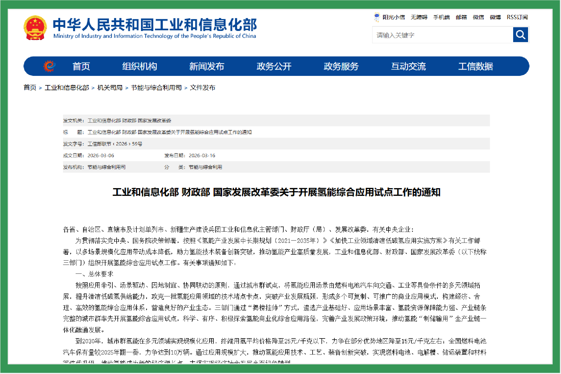 Tthe Ministry of Industry and Information Technology (MIIT), the Ministry of Finance, and the National Development and Reform Commission (NDRC) of the People's Republic of China jointly issued the Notice on Launching Pilot Work for Comprehensive Hydrogen Energy Application.